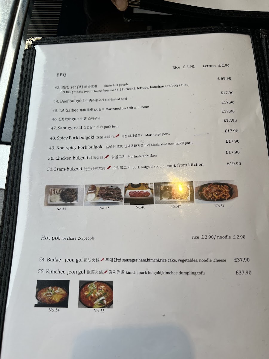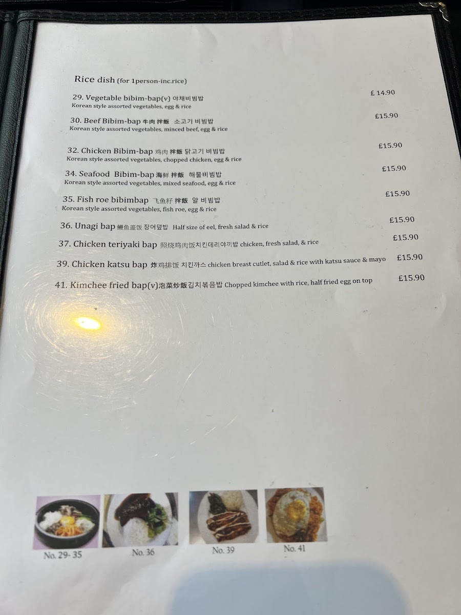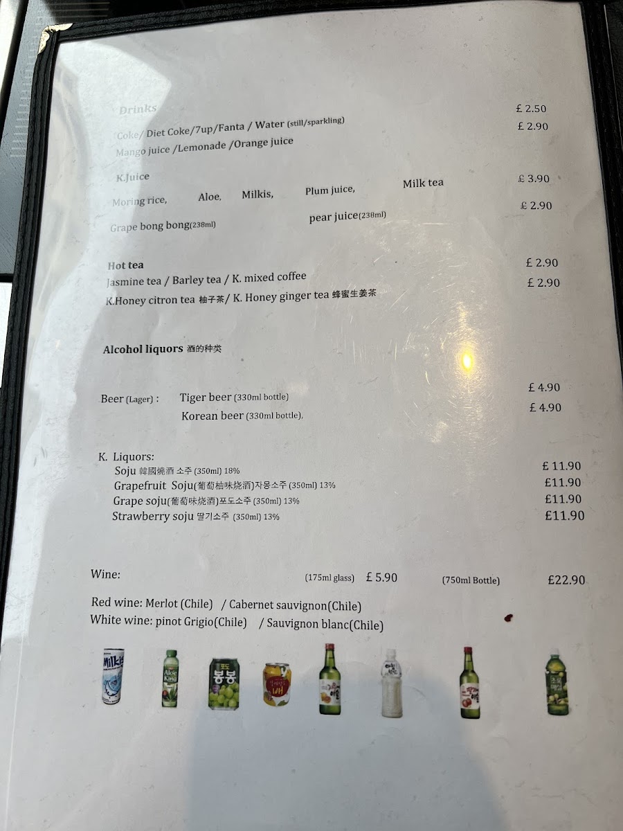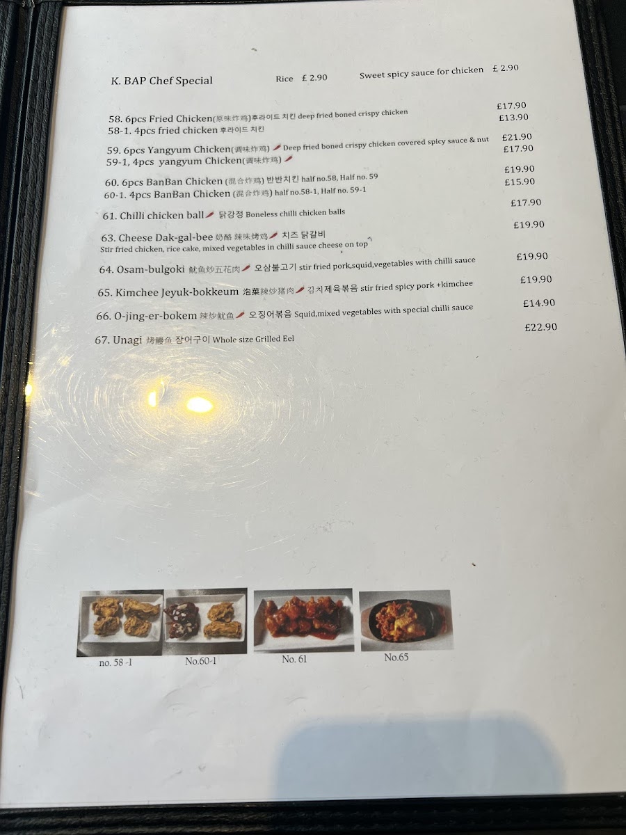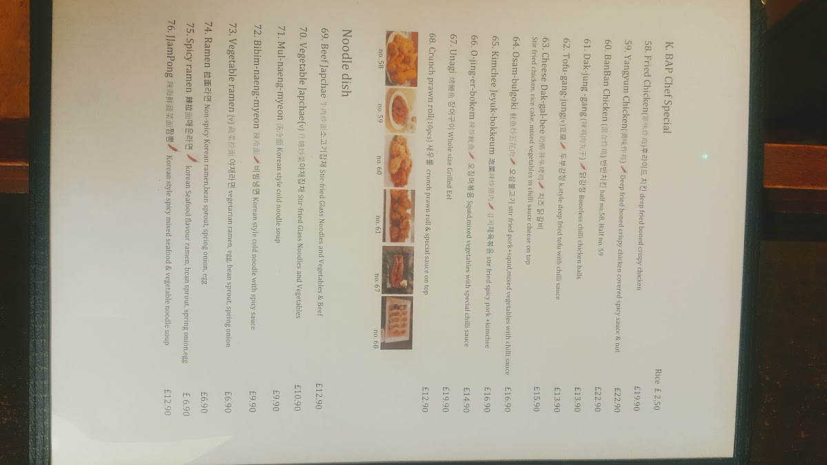 From a reviewer’s perspective, the menu at K.bap Restaurant offers a diverse and satisfying selection that captures the essence of Korean cuisine while remaining accessible. The Single Set Meal options such as Mul Naeng Myon + Moring Rice (500ml) and Jajangmyeon + Moring Rice (500ml) provide convenient combinations, while dishes like Vegetable Japchae (V) + Coke and Beef Japchae + Coke cater to different dietary preferences. The Chef Specials, including Non Spicy Original Fried Chicken (6pcs) and Crunch Prawn Roll (10pcs), stand out for their variety, alongside bold flavors like Osam-Bulgoki and spicy stir-fried squid. The BBQ section, featuring Beef Bulgogi, Spicy Pork Stir Fry, and LA Galbee, delivers classic Korean grilled favorites, complemented by staples like Vegetable Bibim-Bap (V) and Beef Bibimbap in the rice section. Comforting options such as Kimchi Jjigae, Gal Bee Tang, and Haemul-Sundubu-Jjigae enrich the soup offerings, while noodle lovers can enjoy JJamPong Noodle and Mul-Naeng-Myeon. Although prices are only partially listed (e.g., Vegetable Bibim-Bap (V) and numbered items like 54. Budae-Jeon), the menu remains appealing with its breadth, complemented by drinks like Rice Drink (500ml) and Korean Beer (330ml Bottle). Overall, the menu feels well-rounded, flavorful, and suitable for both quick meals and more indulgent Korean BBQ experiences.