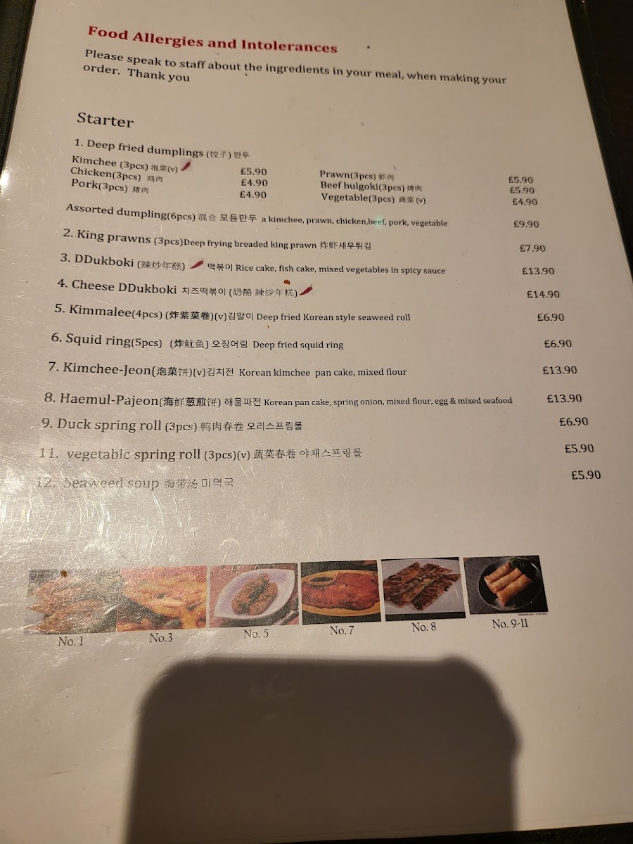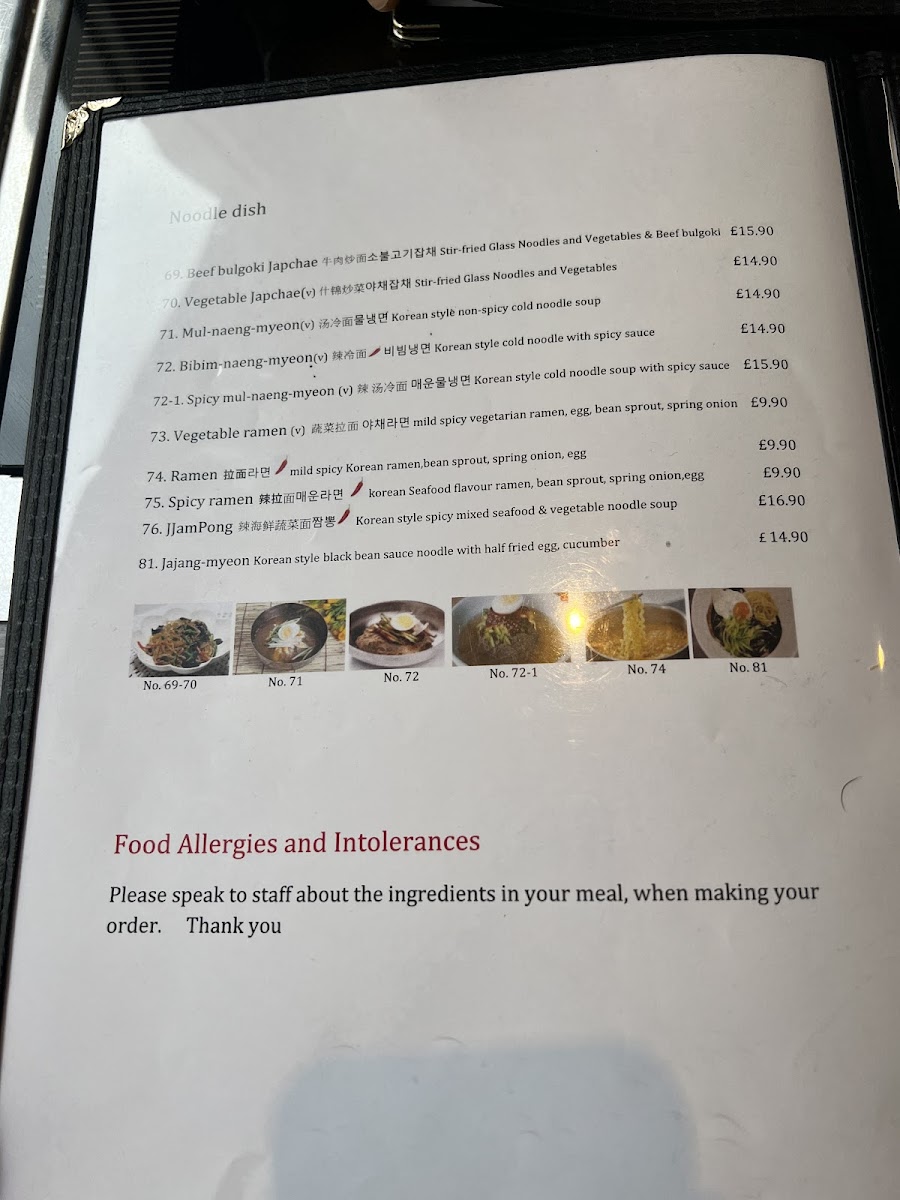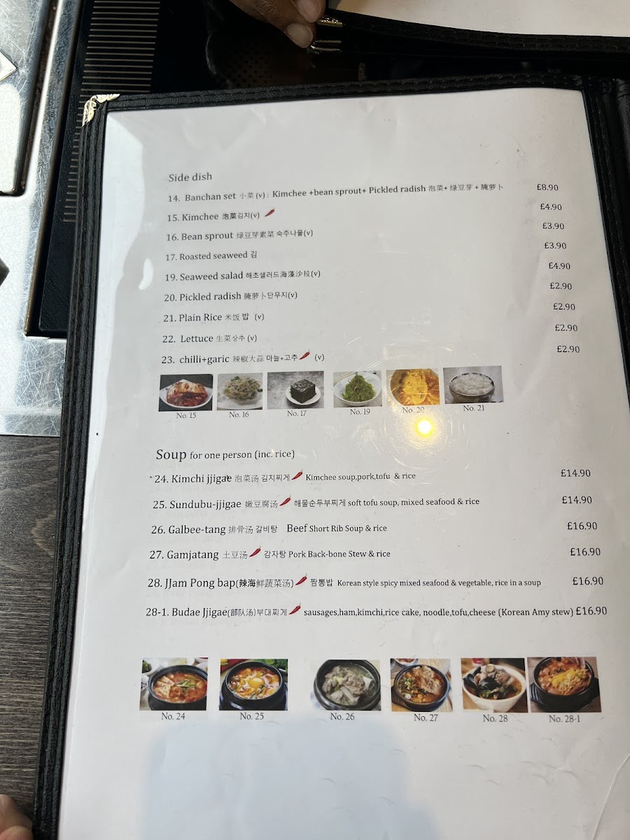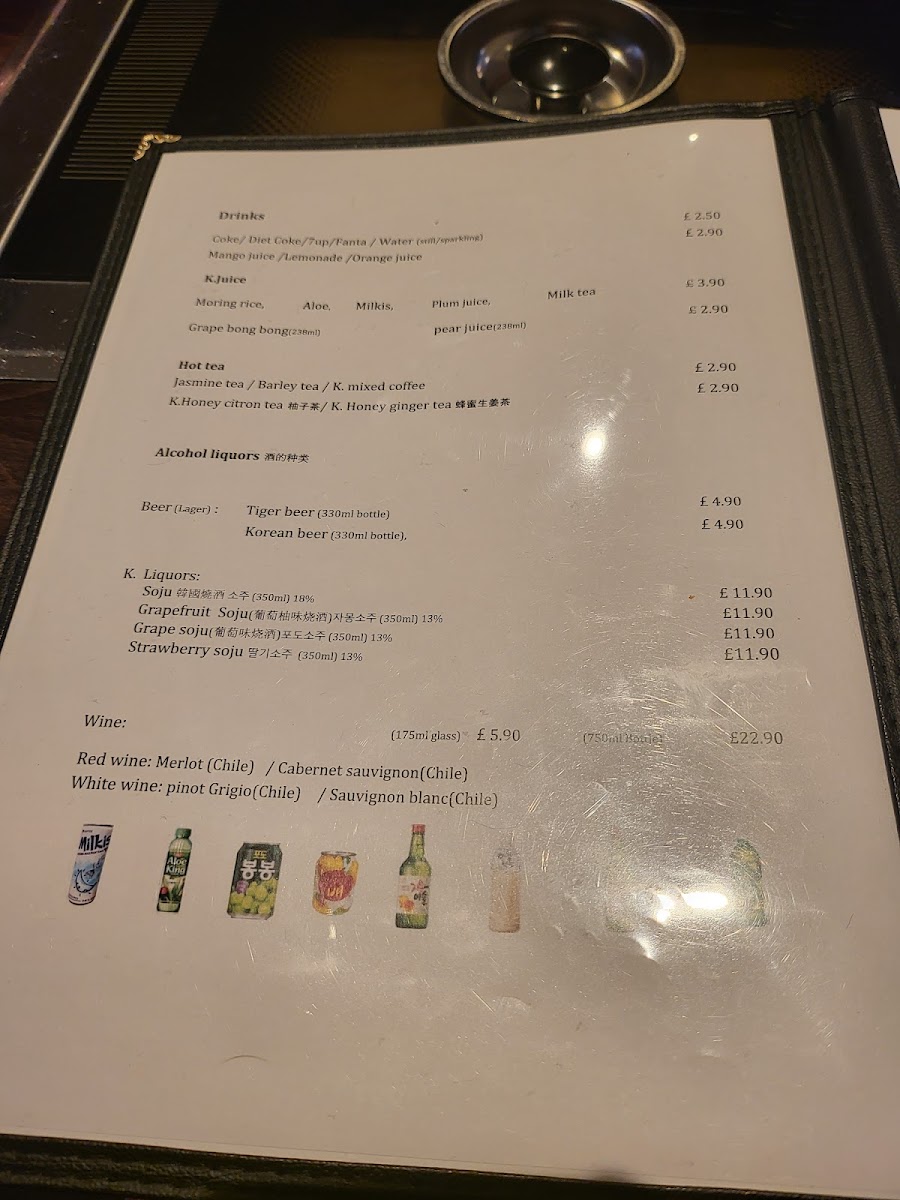 From a reviewer’s perspective, the menu at K.bap Restaurant offers a diverse and satisfying selection that captures the essence of Korean cuisine while remaining accessible. The Single Set Meal options such as Mul Naeng Myon + Moring Rice (500ml) and Jajangmyeon + Moring Rice (500ml) provide convenient combinations, while dishes like Vegetable Japchae (V) + Coke and Beef Japchae + Coke cater to different dietary preferences. The Chef Specials, including Non Spicy Original Fried Chicken (6pcs) and Crunch Prawn Roll (10pcs), stand out for their variety, alongside bold flavors like Osam-Bulgoki and spicy stir-fried squid. The BBQ section, featuring Beef Bulgogi, Spicy Pork Stir Fry, and LA Galbee, delivers classic Korean grilled favorites, complemented by staples like Vegetable Bibim-Bap (V) and Beef Bibimbap in the rice section. Comforting options such as Kimchi Jjigae, Gal Bee Tang, and Haemul-Sundubu-Jjigae enrich the soup offerings, while noodle lovers can enjoy JJamPong Noodle and Mul-Naeng-Myeon. Although prices are only partially listed (e.g., Vegetable Bibim-Bap (V) and numbered items like 54. Budae-Jeon), the menu remains appealing with its breadth, complemented by drinks like Rice Drink (500ml) and Korean Beer (330ml Bottle). Overall, the menu feels well-rounded, flavorful, and suitable for both quick meals and more indulgent Korean BBQ experiences.